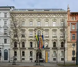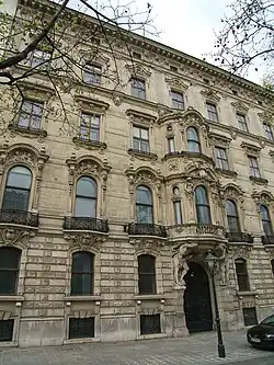 Le palais a quatre étages. La façade de style néo-baroque est en pierres apparentes et non en plâtre, ce qui ne se produisait autrement que dans les bâtiments publics de la Ringstrasse [1]. La partie incurvée vitrée, soutenue par deux atlantes et s'étendant sur deux étages, est frappante.