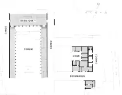 Les murs de deux insulæ (immeubles romains) y sont trouvés, environ 80 cm à 2 m sous terre. Ces bâtiments auraient peut-être eu des fonctions militaires, si l'on situe une portion du rempart antique à la rue Pierre-et Marie-Curie adjacente[2].