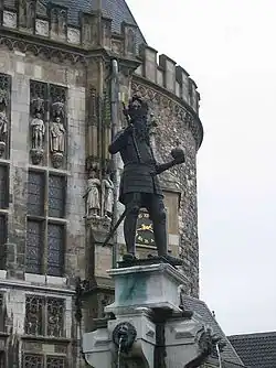 Le souvenir de l’Empire de Charlemagne resta pourtant vivace et devint le symbole du pouvoir germanique : ainsi, au Xe siècle, Otton Ier (912-973) y fut couronné roi de Germanie (936)[45]. La cérémonie eut lieu en trois temps dans différents lieux du palais : d’abord dans la cour (élection par les ducs), puis dans la chapelle (remise des insignes royaume), enfin dans le palais (banquet)[46]. Lors de la cérémonie, Othon s’était assis sur le trône de Charlemagne. Par la suite et jusqu’au XVIe siècle, tous les empereurs germaniques furent d’abord couronnés à Aix puis à Rome, ce qui dénote la volonté de reprendre l’héritage politique de Charlemagne. La Bulle d’or de 1356 confirma que le sacre et le couronnement devaient se faire dans la chapelle palatine.
