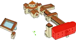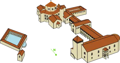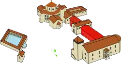 En dehors du complexe palatial se trouvaient un gynécée, une caserne, un hospice[18], un parc de chasse et une ménagerie dans laquelle vivait l’éléphant Abul-Abbas, offert par le calife de Bagdad Hâroun ar-Rachîd. Ermold le Noir la décrit dans un passage de son Poème sur Louis le Pieux (première moitié du IXe siècle) :