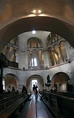 Les deux étages (tribunes) s’ouvrent sur l’espace central par des baies en plein cintre, soutenues par des colonnes. Le pourtour intérieur forme un octogone alors que le côté extérieur se développe en un polygone à seize côtés. La chapelle disposait de deux chœurs placés à l’est et à l’ouest. Le roi s’asseyait sur un trône constitué de plaques de marbre blanc, au premier étage et à l’ouest ; il était entouré par les proches de sa cour. Il avait ainsi vue sur trois autels : celui du Sauveur, juste en face, celui de la Vierge au rez-de-chaussée et celui de saint Pierre, au fond du chœur oriental[9].