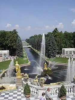 Les cent soixante-seize fontaines de Peterhof fonctionnent sans pompe, uniquement par gravité depuis le réservoir au-dessus, alimenté par un réseau d'aqueducs dont un de plus de quatre kilomètres. Près de 34 000 litres d'eau sont éjectés chaque seconde par les fontaines de Peterhof.