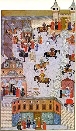 Le palais de Topkapı était la résidence principale du sultan et de sa cour ; il était aussi le siège officiel du gouvernement. Son accès était strictement réglementé, mais ses habitants avaient rarement à en sortir, car le palais était presque autonome, une ville dans la ville. Les salles d'audiences et les espaces de conférences servaient aussi aux questions liées à l'administration politique de l'empire. Pour les résidents comme pour les hôtes, le palais disposait de son propre approvisionnement en eau grâce aux citernes et les grandes cuisines fournissaient les repas. La cour disposait de dortoirs, jardins, bibliothèques, écoles, même de mosquées.