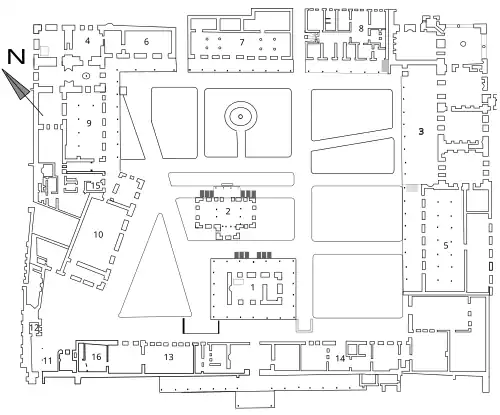 1) Fontaine du bourreau • 2) Porte du milieu, entrée du musée • 3) Deuxième Cour • 4) Selâm ou pierre de bienvenue • 5) Sommet de la citerne byzantine • 6) Vieux puits • 7) Fontaine • 8) Porte de la Mort • 9) Mosquée de Haci Beşir Ağa • 10) Porte de la mosquée • 11) Porte extérieure de la Mort • 12) Écuries impériales • 13) Dortoirs des hallebardiers à tresses • 14) Terrasse • 15) Arcades avec inscriptions anciennes • 16) Porte des Carrosses, vers le harem • 17) Chambre du Conseil impérial • 18) Chambre des scribes • 19) Chambre du grand Vizir • 20) Trésor impérial • 21) Pierre cible • 22) Monument à Sukhum • 23) Porte vers les pompes du palais • 23a) Pompes • 24) Cuisine des sultans, des princes et de la sultane validé • 26) Cuisine des femmes du harem • 27) Cuisine des sentinelles • 28) Cuisines du divan • 29) Cuisine des pages • 30) Cuisine des serviteurs • 31) Cuisine des femmes servant le harem • 32) Cuisine pour les servants civils du divan, pièce du fabricant de café et pâtisserie • 33) Mosquée des cuisiniers • 34) Dortoir des apprentis cuisiniers et plongeurs • 35) fonderie d'étain • 36) zone utilisée par les serviteurs de la cuisine • 37) Porte de la Félicité • 38) Troisième Cour • 39) Salle d'audience • 40) Librairie d'Ahmed III • 41) Quartiers des eunuques blancs • 42) Porte de la volière • 43) Cuisine privée du sultan • 44) Rue de marbre du pavillon du manteau sacré à la salle du trône • 45) Mosquée des Ağas • 46) Mosquée du harem • 47) Chapelle • 48) Dortoirs des pages de la chambre forte sacrée • 49) Chambre forte sacrée • 50) Salle du foulard • 51) Pavillon du manteau sacré • 51a) Antichambre de la chambre forte sacrée • 51b) Salle du manteau sacré • 52) Pierre où s'arrêtait le sultan • 53) Fontaine • 54) Trésor des reliques sacrées (anc. Trésor des armures) • 55) Dortoir des pages du trésor • 56) Dortoir des pages du commissariat • 57) Passage souterrain de la troisième à la quatrième cour • 58) Trésor impérial • 59) Dortoir des pages royaux • 60) Conservatoire • 61) Quartiers des eunuques blancs • 62) Corridor à piliers • 63) Porte vers le harem et la route dorée • 64) Salle des circoncisions • 65) Pavillon d'Erevan • 66) Quatrième Cour (jardin des tulipes) • 67) Fontaine à étages • 68) Piscine avec jets sur la terrasse • 69) Terrasse de marbre • 70) Jardins Iftariye • 71) Porte des éléphants ou du jardin • 72) Pavillon de Bagdad • 73) Pavillon sur la terrasse et pavillon de Mustafa pacha • 74) Salle du médecin principal • 75) Jardin de la quatrième cour • 76) Porte des jardins privés, reliant la quatrième et la cinquième cour, aujourd'hui partie du parc Gülhane • 77) Guérites • 78) Grand Pavillon • 79) Mosquée sur la terrasse • 80) Garde-robe • 81) Piscine sculptée de thèmes marins.