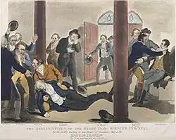 L’ancien palais de Westminster fut également le théâtre de l’assassinat d’un Premier ministre en 1812[18] : alors qu’il se rendait à la Chambre des communes pour y répondre aux questions des parlementaires, Spencer Perceval fut abattu par un certain John Bellingham. Il reste à ce jour le seul Premier ministre britannique à avoir succombé à un meurtre.