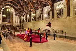 Westminster Hall a également toujours été le théâtre d’un certain nombre de cérémonies. Du XIIe siècle au XIXe siècle, les banquets de couronnement organisés en l’honneur des nouveaux monarques se tinrent là. Le dernier banquet fut celui du roi George IV, en 1821[14]. Son successeur Guillaume IV décida d’abandonner cette pratique, la jugeant trop coûteuse. Le Hall a pu par ailleurs servir de salle de deuil pour les funérailles particulièrement importantes. Cet honneur, habituellement réservé au souverain et aux princes consorts, n’a été accordé que rarement à des non-royaux, par exemple pour Winston Churchill en 1965. Le dernier deuil en date est celui de la reine Elisabeth II, en 2022.
