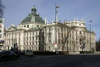 L'ancien palais de justice fut construit en pierre de 1890 à 1897 par l'architecte Friedrich von Thiersch dans un style néo-baroque du côté ouest de la Karlsplatz (Stachus). Le bâtiment du Gründerzeit est dominé par un dôme en verre central (67 mètres). Le bâtiment mesure 138 mètres de long et 80 mètres de profondeur. Le centre du bâtiment, conçu autour de deux cours, est le hall central de 19 m sur 29 m. La façade est fortement marquée par l'avant-corps central avec un front convexe et des obélisques surplombant les quatre côtés.
