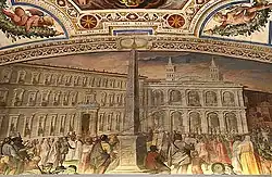 Immédiatement après son élection, Sixte V commande à Domenico Fontana la restauration de la façade de la basilique et la construction du palais sur un site réduit, derrière une façade modestement austère. Les travaux sont conduits avec diligence et, le , la nouvelle annonce : « un grand palais sur la place de Latran a été édifié par Sixte V. » Fontana reprend certaines des solutions apportées ici dans le palais du Quirinal et les appartements papaux au Vatican.