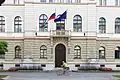 Le bâtiment de trois étages a été construit dans le style néo-Renaissance[9]. Il y a deux cours et la grande salle[6] appelée salon de cristal, qui est maintenant utilisée pour les réceptions, mais qui était à l'origine une chapelle[7]. La façade avant, tournée vers la rue Prešeren, a trois entrées. Sur les côtés de l'entrée principale, qui se trouve au milieu, se dressent les statues allégoriques du pouvoir et de la loi, créées par l'architecte viennois Josef Beyer[10]. Il y a aussi deux entrées secondaires à l'avant, une de chaque côté de l'entrée principale. Ces entrées s'ouvrent sur une avenue animée de la ville et ne donnent pas l'impression typique d'un bâtiment protocolaire[8]. Les angles du bâtiment sont soulignés par des tours[6]. L'intérieur a été décoré dans l'entre-deux-guerres par Gojmir Anton Kos avec des scènes de l'histoire de la Slovénie.