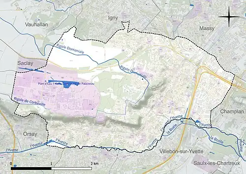 Le territoire de la commune est séparé d’Orsay et Villebon-sur-Yvette par la rivière l’Yvette qui marque ainsi toute la frontière est et sud de la commune. Un lac naturel fait office de bassin de retenue dans le quartier de Lozère, à proximité d’Orsay. Un ruisseau souterrain suit le trajet de l’autoroute A 10 pour se jeter dans la rivière. Un grand lac artificiel a été aménagé dans le parc de l’École polytechnique. Sur le plateau, des rigoles canalisent le ruisseau de Corbeville depuis Orsay jusqu’à l’étang de Saclay en passant par la forêt domaniale : rigole de l’État, rigole des Granges et rigole Domaniale.