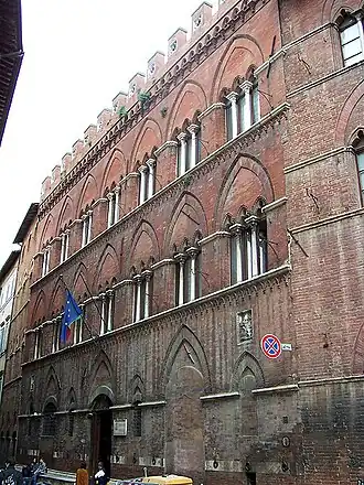 Issu des Tegliacci, c'est un des plus ouvragés palais privés de Sienne. Datant du début du Quattrocento, de style gothique tardif, sa façade en brique est crénelée en haut et possède une banquette au niveau de la rue. Ses deux étages supérieurs sont équipés de fenêtres trifores séparées par des bandes lombardes.