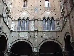 Le Palazzo Pubblico, édifice emblématique de la ville de Sienne, est un monument civil dont la construction fut entamée à la fin du XIIIe siècle et achevée vers le milieu du XIVe siècle[1]. On y retrouve les éléments architecturaux qui caractérisent le gothique siennois. Il se situe dans le bas de la Piazza del Campo, la place centrale de Sienne qui accueille 2 fois par an le Palio. On y entre par la cour : le Cortile del Podestà.