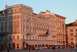 Plus tard, en 1872, Geiringer et Righetti apportent une série de modifications à la façade sur la Piazza Unità d'Italia : le projet original de Buttazzoni considère en effet comme façade principale celle sur le passo di Piazza, imaginant que cette rue serait plus fréquentée du fait du passage des personnes se dirigeant vers le Teatro Verdi voisin, inauguré en 1801, et vers le Palazzo del Tergesteo en construction à la même période. La transformation urbaine de la place au début des années 1870 accroit l'importance de la façade qui la surplombe[1],[3],[4].