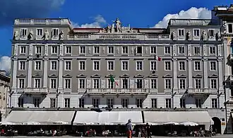 L'apparence de la façade principale, sur la Piazza Unità d'Italia, est le résultat de la rénovation par Eugenio Geiringer et Giovanni Righetti en 1872 : aux deuxième et troisième étages, la présence des corps latéraux est accentuée par quatre lésènes cannelées avec des chapiteaux ioniques, tandis qu'à l'étage les lésènes laissent place à des décorations florales. Un décor de festons est également présent dans le cadre de couronnement du cinquième étage. Au-dessus des corps latéraux, dans les espaces entre les fenêtres, se trouvent quatre statues représentant des divinités classiques. Le corps central et les corps latéraux sont couronnés par un parapet en marbre qui reprend le motif des balcons situés au deuxième étage[1],[4].