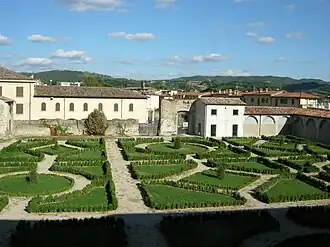 La façade principale, décorée à graffiti entre 1532 et 1535 par Cristofano Gherardi, dit « Doceno » d'après un dessin de Giorgio Vasari, donne sur un jardin qui au XVIe siècle était fameux dans toute l'Europe par sa collection de plantes exotiques.