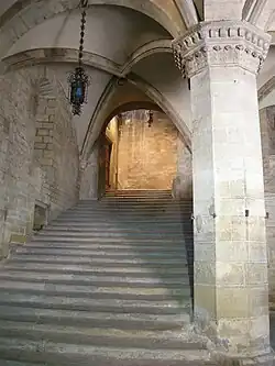 L'intérieur comporte une grande voûte maintenue par de grands piliers polygonaux. Un grand escalier monumental mène aux étages qui conservent les archives et la Sala Maggiore où l'on peut voir des inscriptions romaines sur les murs.