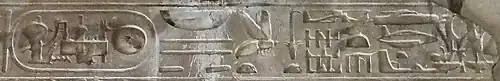La partie gauche constitue une titulature royale (l'ensemble des noms officiels par lesquels on désigne le pharaon dans les textes juridiques et les dédicaces), composée de cinq grands noms, chacun formé d'un titre suivi d'un nom. Dans cette titulature, qui se lit de droite à gauche, le nom de Nesout-bity représenté par un roseau et une abeille, complétés par les deux pains en demi-lune, est le nom de couronnement du roi. La corbeille, les deux traits longs et les deux traits courts veulent dire « Maître des deux terres ». Le groupe suivant est un cartouche royal où se superposent des signes d'époques différentes, formant ce qu'on appelle un palimpseste[3]. Le cartouche originel est le nom de Nesout-bity Menmaâtrê (« La justice de Rê demeure ») de Séthi Ier, le cartouche ultérieur celui de Sétepenrê (« l'élu de Rê »).