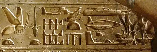 - ↑ Le nom « Hiéroglyphes de l'hélicoptère » a été donné à cette partie de la gravure hiéroglyphique.