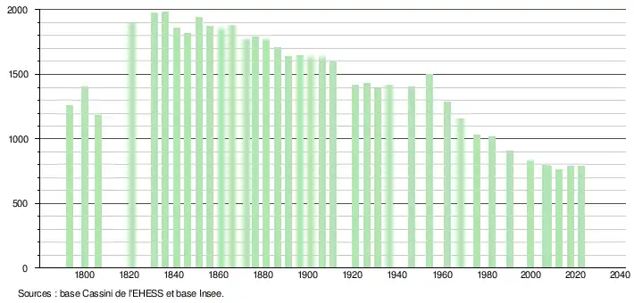 L'évolution du nombre d'habitants est connue à travers les recensements de la population effectués dans la commune depuis 1793. Pour les communes de moins de 10 000 habitants, une enquête de recensement portant sur toute la population est réalisée tous les cinq ans, les populations de référence des années intermédiaires étant quant à elles estimées par interpolation ou extrapolation[38]. Pour la commune, le premier recensement exhaustif entrant dans le cadre du nouveau dispositif a été réalisé en 2007[39].