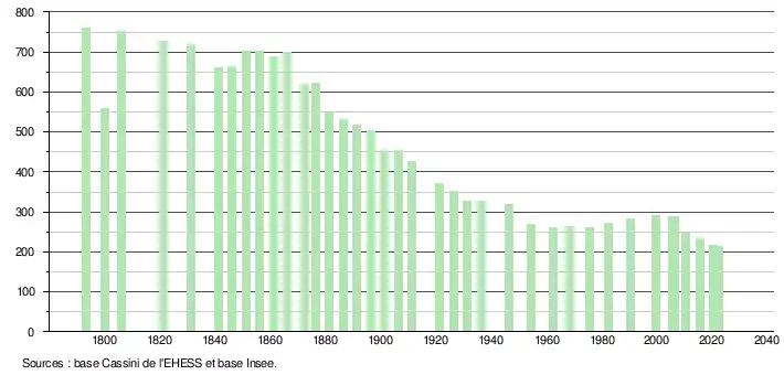 L'évolution du nombre d'habitants est connue à travers les recensements de la population effectués dans la commune depuis 1793. Pour les communes de moins de 10 000 habitants, une enquête de recensement portant sur toute la population est réalisée tous les cinq ans, les populations de référence des années intermédiaires étant quant à elles estimées par interpolation ou extrapolation[35]. Pour la commune, le premier recensement exhaustif entrant dans le cadre du nouveau dispositif a été réalisé en 2005[36].