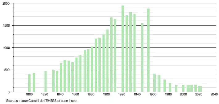 L'évolution du nombre d'habitants est connue à travers les recensements de la population effectués dans la commune depuis 1800. Pour les communes de moins de 10 000 habitants, une enquête de recensement portant sur toute la population est réalisée tous les cinq ans, les populations de référence des années intermédiaires étant quant à elles estimées par interpolation ou extrapolation[8]. Pour la commune, le premier recensement exhaustif entrant dans le cadre du nouveau dispositif a été réalisé en 2005[9].