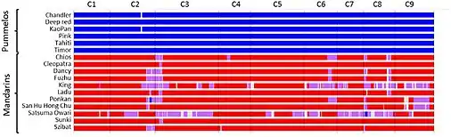 Les 6 principales variétés de pomelo ('Chandler', 'Kao Pan', ‘Deep Red’, ‘Pink’, ‘Tahiti’, 'Tinor' ) ne montrent aucune introgression de mandarine (contrairement aux multiples mandariniers où l'introgression de pomelo est quasi universelle), ce sont de très bons représentants de C . maxima (2017)[7]. L'introgression de C. medica dans le pomelo 'Timor' est quasi insensible et ne modifie pas l'analyse[8].