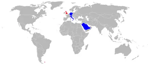 - Pendant la première guerre civile libyenne (2011), des Tornado GR.4 britanniques[6] et Tornado ECR italiens[7] sont engagés en Libye du à octobre 2011 dans le cadre de la résolution 1973 des Nations unies ;