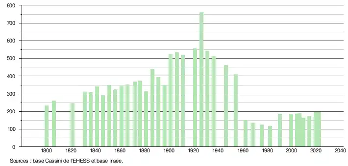 L'évolution du nombre d'habitants est connue à travers les recensements de la population effectués dans la commune depuis 1800. Pour les communes de moins de 10 000 habitants, une enquête de recensement portant sur toute la population est réalisée tous les cinq ans, les populations de référence des années intermédiaires étant quant à elles estimées par interpolation ou extrapolation[8]. Pour la commune, le premier recensement exhaustif entrant dans le cadre du nouveau dispositif a été réalisé en 2004[9].