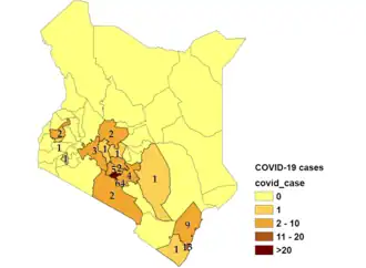 Le , le premier cas de Covid-19 est détecté au Kenya, chez une femme venue des États-Unis via Londres[2]. La barre des 10 cas est dépassé le 22 mars[3], celle des 100 cas le 2 avril[4], celle des 1 000 cas le 20 mai, celle des 10 000 cas le 12 juillet 2020, et celle des 100 000 cas le 25 janvier 2021.