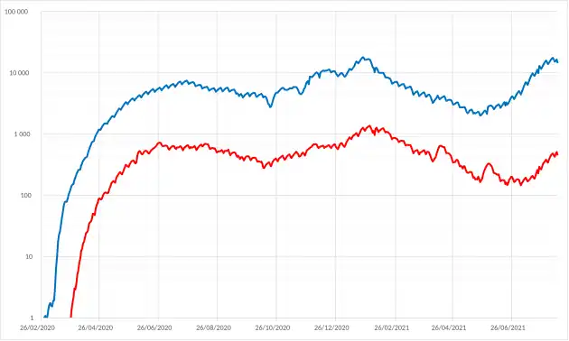 Le lundi , 18 États passent en situation dite de "feu rouge" (semáforo rojo)[179]. Si officiellement ils ne retournent pas en quarantaine, seuls les commerces essentiels - principalement ceux liés à la nourriture, l'hygiène et l'énergie - les établissements médicaux et les administrations régaliennes sont autorisés à rester ouverts, ce qui reproduit de fait la plupart des conditions de la quarantaine du début de la pandémie[180]. Les 14 autres États passent en "feu orange" (semáforo naranja), ce qui signifie que d'autres lieux sont autorisés à rester ouverts, mais les établissements hôteliers et de sport ne peuvent accueillir du public qu'à 50% de leurs capacités habituelles, et les établissements culturels qu'à 25%[181]. Cette situation doit être réexaminée et actualisée le [179].