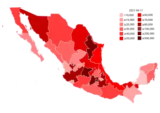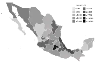 Au , il y avait 3 645 décès avec un lien confirmé avec la Covid-19, 35 022 cas confirmés cumulés dont 8 457 cas actifs, 19 979 cas suspects, et 130 956 personnes avaient été étudiées[126]. Ce à quoi on peut rajouter 247 décès dont un lien avec le SARS-CoV-2 est suspecté mais pas confirmé[126]. Les zones les plus touchées étaient par ordre décroissant : la ville de Mexico puis les États de Mexico, Tabasco, Veracruz, Basse-Californie, Morelos et du Yucatan[126].