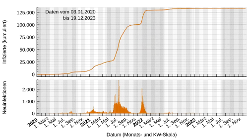 En novembre il y avait 797 nouveaux cas et 14 décès, portant le nombre de cas à 5 934 dont 49 décès[21].