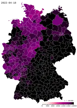 Le , l'Allemagne dénombre officiellement 8 604 cas ainsi que 30 décès et plus de 46 personnes rétablies. Le , l'Allemagne compte 685 721 cas et 11 385 décès[8], avec un taux de contagion qui repart à la hausse[9]. Au , le pays compte 24 000 morts[6].