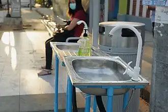 Un point d'eau pour se laver les mains installé à un arrêt d'autobus en mars 2020 en Birmanie.