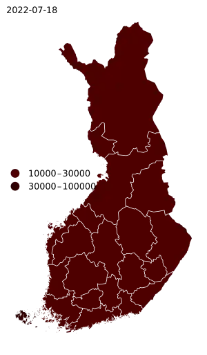 THL considère le chiffre donné par le registre finlandais des maladies infectieuses comme le chiffre officiel et, le , 304 des cas confirmés avaient été signalés au registre[33],[28]. Le lendemain, environ 450 cas avaient été confirmés dans le pays. Le plus grand nombre de cas a été identifié dans le district hospitalier d'Helsinki et d'Uusimaa, dans le sud de la Finlande.