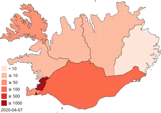 Le , le nombre total de cas enregistrés est de 1 785, dont 1 462 se sont rétablis et 10 sont décédés. Avec une population totale de 364 260 habitants (au ), le taux d'infection est d'un cas pour 245 habitants, l'un des plus élevés au monde. Toutefois, le pays est également celui où le nombre de tests effectués par habitant est le plus élevé au monde[3]. Il s'agit notamment d'un dépistage de la population générale dirigé par la société islandaise deCODE genetics pour déterminer la véritable propagation du virus dans la population[4]. Au , le taux de létalité lié au Covid-19 en Islande était le deuxième plus bas au monde, à 0,29 %[5].