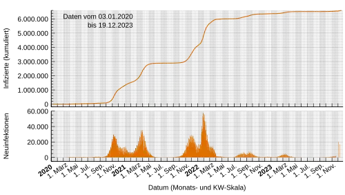 Au 14 janvier, selon le ministère polonais de la Santé, environ 21,3 millions de Polonais sont vaccinés avec deux doses, dont plus de 8 millions avec une troisième dose. La Pologne a cumulé 4,28 millions de cas d'infection, et 101.841 décès[9].