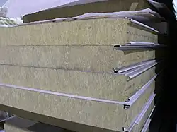 - couche d'isolant intérieur rigide d'environ 30 à 200 mm d'épaisseur, de haute performance mécanique et thermique en mousse de polyuréthane (PUR), polyisocyanurate (PIR), laine de roche, nid d'abeilles, etc.
