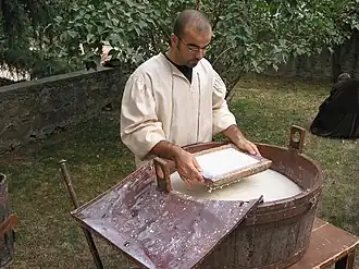- L'ouvreur crée la feuille en répartissant une quantité de pâte à papier dans la forme.
