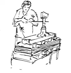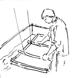 - 2) une forme ouvrante (ou forme vergée) constituée d’un châssis et d’un tamis. Le châssis est fait de quatre tringles de bois, réunies par des barres régulièrement espacées qui supportent le tamis. Celui-ci est fait d’une natte de minces tiges de bambou[3].
