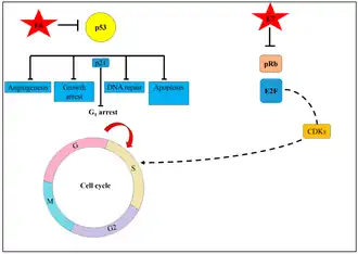 L'activation de p53 active normalement l'inhibiteur de kinase dépendant de la cycline (p21) pour forcer les cellules à rester à l'arrêt G1[40]. Cependant, lors de l'infection par le VPH, l'E6 dégrade p53, ce qui fait entrer les cellules dans la phase S du cycle cellulaire[40]. Simultanément, l'oncoprotéine E7 se lie à la protéine du rétinoblastome (pRb). La liaison de E7 à pRb lui fait libérer E2F, un facteur de transcription qui active la kinase dépendante de la cycline (CDK). Cela entraîne une perte de contrôle du cycle cellulaire, permettant aux cellules de rentrer dans la phase S (réplication) du cycle cellulaire. Les cellules infectées se différencient et prolifèrent entraînant un risque élevé d'apparition de cellules dysplasiques[40].