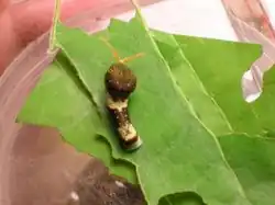 Durant les trois premiers stades larvaires, la chenille est brune et ressemble à une fiente d'oiseau. Ce mimétisme la protège contre d'éventuels prédateurs. À partir du quatrième stade larvaire, la larve devient verte avec deux taches jaunes qui ressemble à des yeux. Juste derrière ceux-ci, on retrouve une ligne transversale jaune. La larve mature pratique la contre-illumination, une forme de camouflage qui se traduit par une pigmentation plus sombre sur la face dorsale que sur la face ventrale[3].