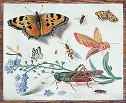 Cette tradition se trouve poursuivie dans les gravures sur bois d'Ulisse Aldrovandi pour son De Animalibus Insectis, publié en 1602 et quelques décennies plus tard dans l’Insectorum Theatrum de Thomas Muffet (1634). Jan van Kessel demeure fidèle à cet esprit dans ses huiles sur cuivre (musée d'Amsterdam) ou sur marbre[22].