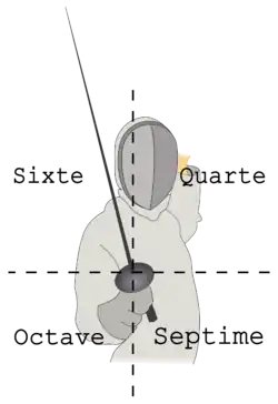 Les parades portent le nom de la position dans laquelle elle est prise c'est-à-dire aux diverses positions de la main, et sont au nombre de huit : la prime, la seconde, la tierce, la quarte, la quinte, la sixte, la septime et l'octave.