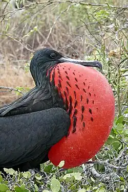 Plusieurs espèces montrent des caractères sexuels secondaires lors de la parade nuptiale. La Frégate superbe en est un exemple. Cette espèce exécute sa parade dans un système de lek. Les mâles, au nombre de six à 30 et perchés au sommet de la végétation, gonflent leur sac gulaire comme de gros ballons rouges. Ils font vibrer leurs ailes, étalent leur queue, écartent les ailes, érigent les scapulaires et pointent le bec vers le haut, la tête penchée par-derrière pour bien exposer le sac gulaire. Le but de cette parade est d'attirer les faveurs des femelles qui survolent le groupe de mâles perchés. La femelle n'a pas la faculté de gonfler son sac gulaire[5].