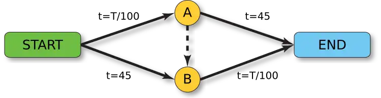 Considérons le réseau décrit dans le diagramme ci-contre, sur lequel 4 000 conducteurs souhaitent passer du point Start au point End. Sur la voie Start-A et la voie B-End, le temps de trajet est égal au nombre de voyageurs (T) divisé par 100, et sur la voie Start-B et la voie A-End, il est constant à 45 minutes. Si la voie en pointillé n'existe pas (le réseau possède alors 4 voies), le temps pour effectuer Start-A-End avec véhicules devrait être . Et le temps pour effectuer Start-B-End avec véhicules devrait être . Si l'une des routes était plus courte, ce ne serait pas un équilibre de Nash : un conducteur rationnel opterait pour la route la plus courte. Comme il y a 4 000 conducteurs, le fait que peut être utilisé pour en déduire que quand le système est à l'équilibre. Par conséquent, chaque trajet dure minutes.