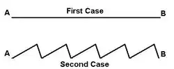 - Dans le second cas, on inclut un profil en dents de scie dans la région comprise entre les points A et B. Ici aussi la bille va rouler de manière aléatoire vers l'une ou l'autre des extrémités avec des probabilités égales.