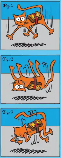 En pratique, les chats ont en effet une aptitude à se retourner quand ils tombent, connue sous le nom de réflexe de redressement du chat. Cela leur permet généralement de retomber sur leurs pattes quand ils sont lâchés d'une hauteur suffisante, soit d'au moins 30 cm[8].