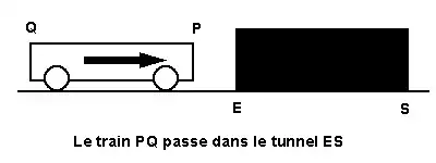 Supposons que le tunnel soit équipé de deux détecteurs, un à l'entrée E et l'autre à la sortie S. Le train, supposé se déplacer à une vitesse proche de celle de la lumière, traverse ce tunnel. Le détecteur de sortie émet un signal lumineux A lorsque l'avant P du train sort du tunnel. Le détecteur d'entrée émet un signal lumineux B lorsque l'arrière Q du train entre dans le tunnel. Autrement dit, l'événement A consiste dans le passage du point P du train devant le point S de la voie et l'événement B dans le passage du point Q du train devant le point E de la voie.