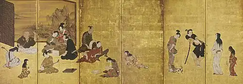 Le paravent de 94 × 274,8 cm peint sur un papier en feuille d'or se plie en six. Il représente des gens dans les quartiers de plaisance de Kyoto jouer de la musique et à des jeux. L'écran vient du domaine féodal de Hikone dirigé par le clan Ii, propriétaire du paravent. Il est désormais la propriété de la ville de Hikone dans la préfecture de Shiga, au sein de la collection II Naochika.